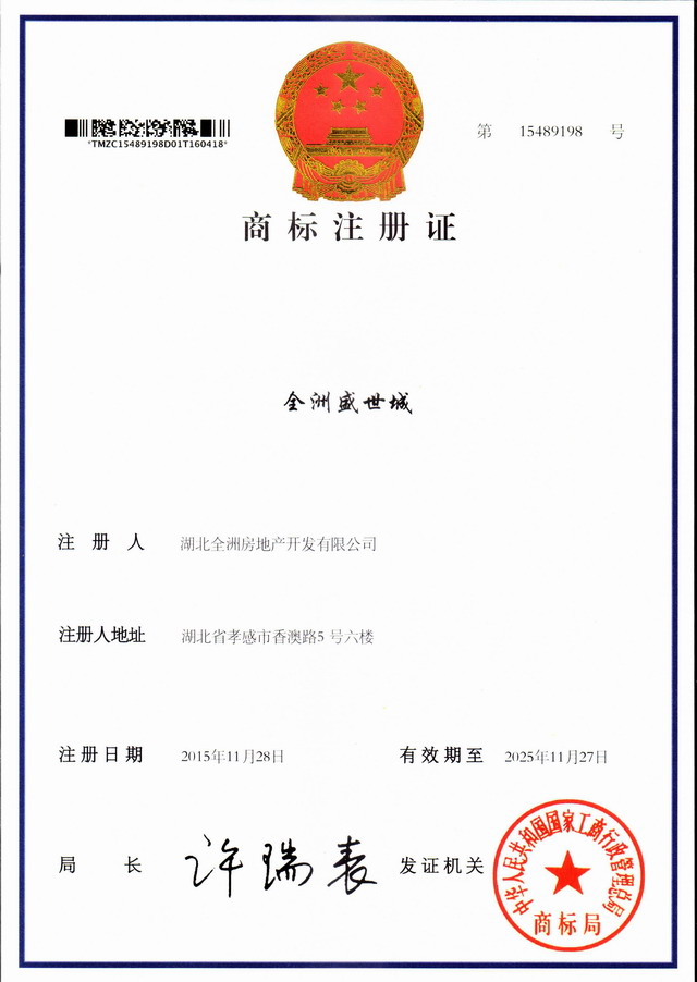 湖北全洲房地产开发有限公司新商标注册成功